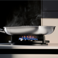 フライパン本体は、耐久性と熱伝導に優れた多層構造になっているので、IHでもガスでも熱を全体に均一に伝えます。オーブン調理にも対応します。(耐熱温度250℃)