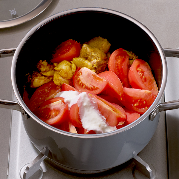 鶏もも肉はひと口大のぶつ切りにする。トマトはへたを取り、くし形切りにする。玉ねぎ、しょうが、にんにくはみじん切りにする。