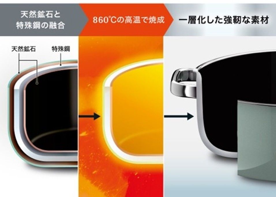 天然鉱石と特殊鋼を860℃の高温で一層化した独自のミネラル素材のため、非常に丈夫で欠けにくく錆びる心配なく、長くお使いいただけます。また、食器洗浄機の使用や金属製キッチンツールも使用可能です。