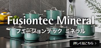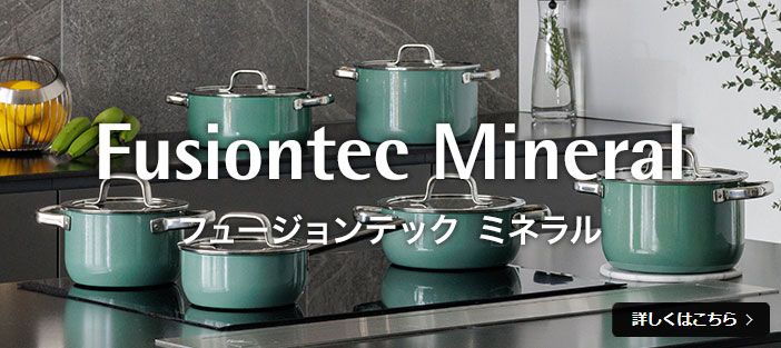 天然鉱石から生まれたミネラル素材「フュージョンテック」。厳選された天然鉱石から生まれた独自のミネラル素材「フュージョンテック」と、ドイツの高いクラフトマンシップが融合した調理器具シリーズ。内径約16cmの「フュージョンテック ミネラル」シリーズのコンパクトな深型両手鍋。