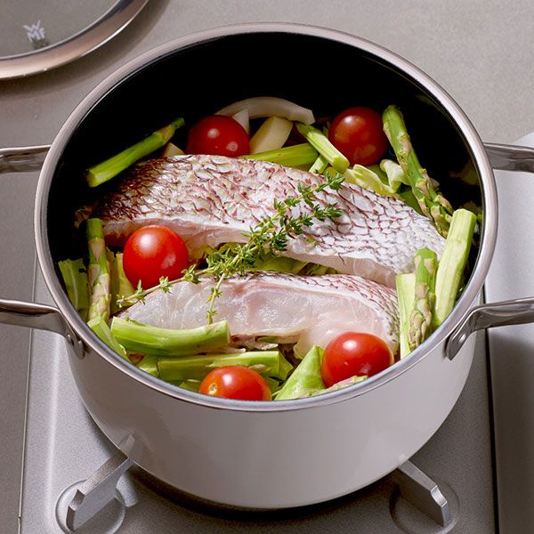 鍋にオリーブ油とにんにくを加えて熱し、玉ねぎ、じゃがいも、キャベツ、魚、ミニトマト、アスパラ、タイムの順にのせ、Aを入れる。蓋をして中火~弱火で15分程、具材に火が通るまで加熱する。