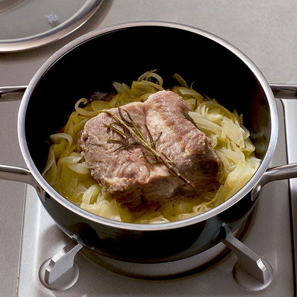 鍋にオリーブ油を熱し、肉と玉ねぎを入れて全体を炒め、ローズマリーを入れて蓋をし、3分焼く。肉をひっくり返して白ワインを加え、蓋をし、時々肉をひっくり返しながら25~30分、中心部に火が通るまで弱火で焼く。
